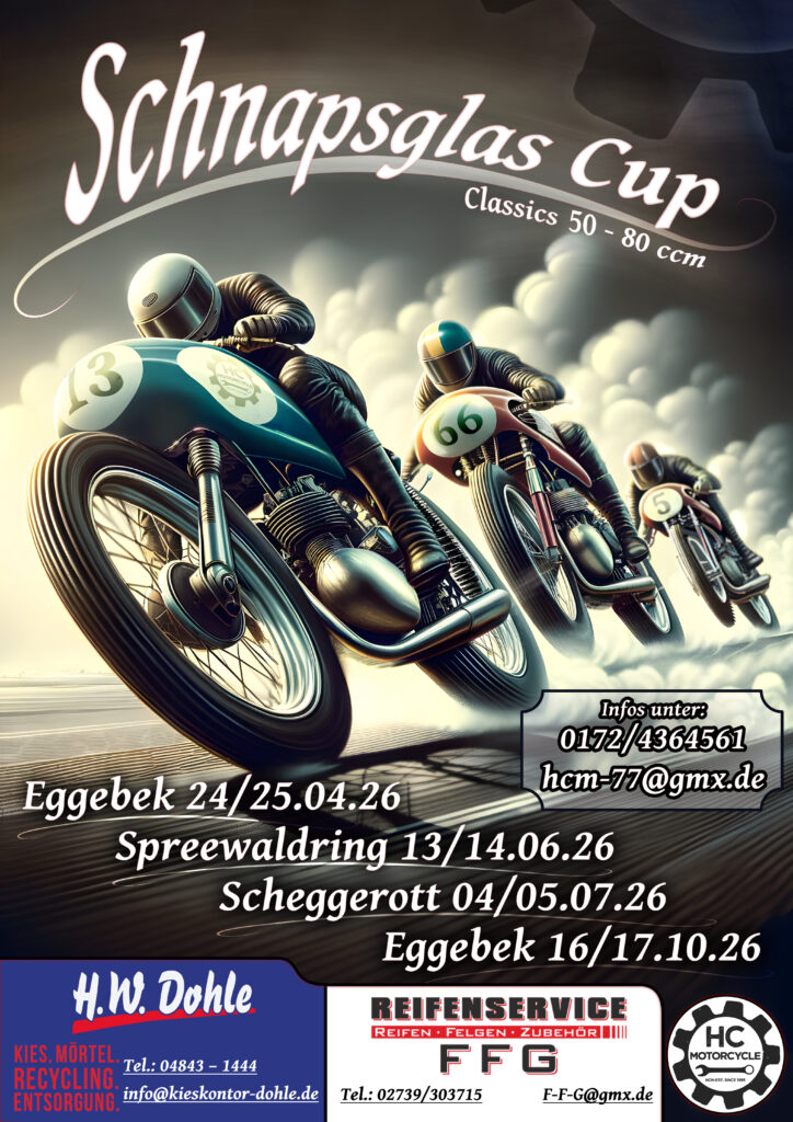 Der Schnapsglas Cup wird 2026 wieder an den Start gehen. 50ccm bis 80ccm Mopeds sind herzlich willkommen.